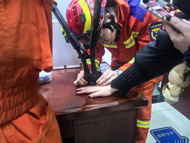 近日,一名女子因戒指卡住手指求助消防人员。北京顺义消防仅用3分钟便解决了问题。